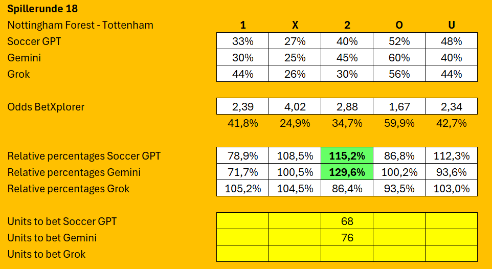 Når vi efter følgende kigger på odds, som vi har hentet fra Betexplorer.com, og derefter kigger på betværdi, som defineret af OddsHunden, så ender det i denne uge kun med et enkelt spil fra to af AI’s mens den sidste ikke havde spil med værdi.